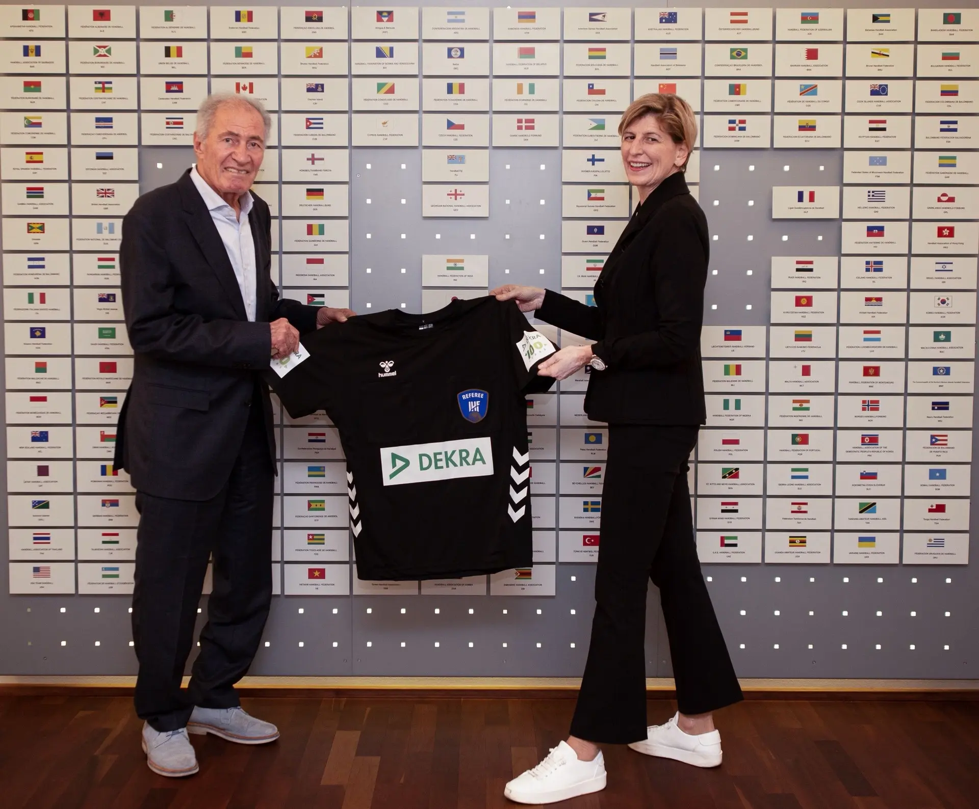 - DEKRA is the official refereeing partner of the upcoming Handball World Championships. IHF President Dr. Hassan Moustafa (left) and DEKRA Head of Communications Uta Leitner present the new jersey the referees will be wearing.(WEBP, 133.2 KB)